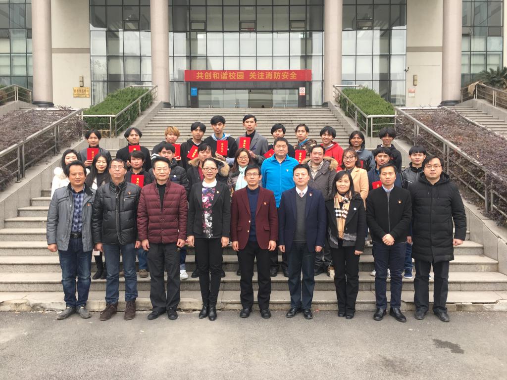 典礼结束之后,学院领导与留学生们在图书馆前合影留念。(校企处 摄影:吴治邦)