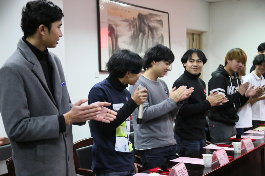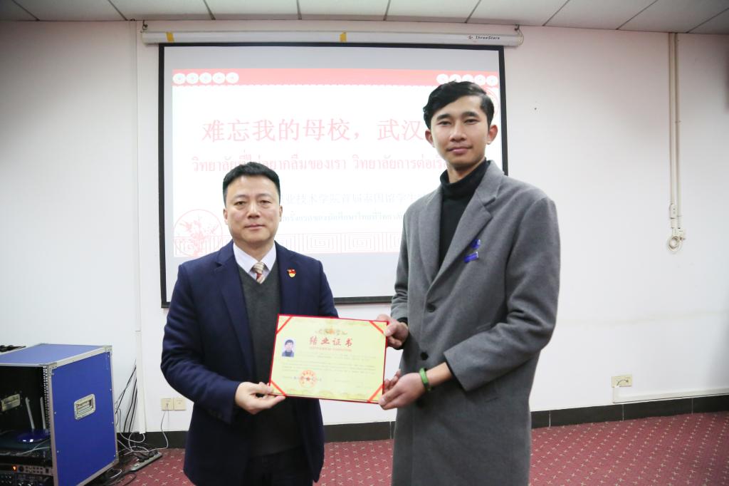 参会领导、老师和全体泰国留学生首先一起观看了院党委宣传部制作的留学生学习生活的纪录片,典礼在热烈的掌声中正式开始。魏院长首先亲自为泰国留学生颁发结业证书并赠送结业礼物。随后15名留学生分别用中文发言的形式向大家表达了心声,他们在发言中说道:“来到武汉船院学习是我们人生中一段非常特殊的经历,在这里我们收获了老师们的关怀与鼓励,感受了船舶实训课堂的魅力,我们要把我们的留学经历、船院故事都告诉我们在泰国的父母及朋友们,让他们知道武汉的美,了解中国的美。”王金娥老师代表留学生项目管理团队任课教师们对留学生们对待学习刻苦钻研的态度和朝气蓬勃的精神表达了充分肯定。黄书记在致辞中表示,留学生除了要关注学习,还要积极投身于中泰文化交流,大学是知识传承、科技创新的地方,也是各种文化交流碰撞的地方,这段留学经历一定能够帮助留学生们用新的视角来看当今的中国和世界,形成新的生活方式和思想观念。最后,黄书记代表我院全体师生祝愿学生们前程似锦再创辉煌,祝愿中泰友谊永久长存。